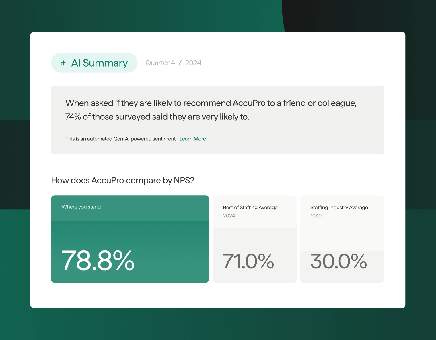 Our AI tools eliminate manual effort and add more value by extracting deeper contextual insights from open-ended responses. With ClearlyRated’s Gen AI-powered tools, we automatically categorize sentiment and enable you to benchmark your performance against the industry, providing instant, actionable insights.