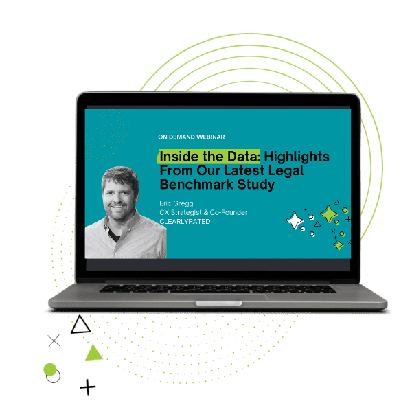 Join ClearlyRated’s CEO Eric Gregg for this quick-hit 30-minute webinar as he reveals brand new research, including the latest NPS® benchmarks for the legal industry and highlights from our Industry Benchmark Study. Get a sneak preview of our upcoming report, and gain insight into the minds of legal buyers.